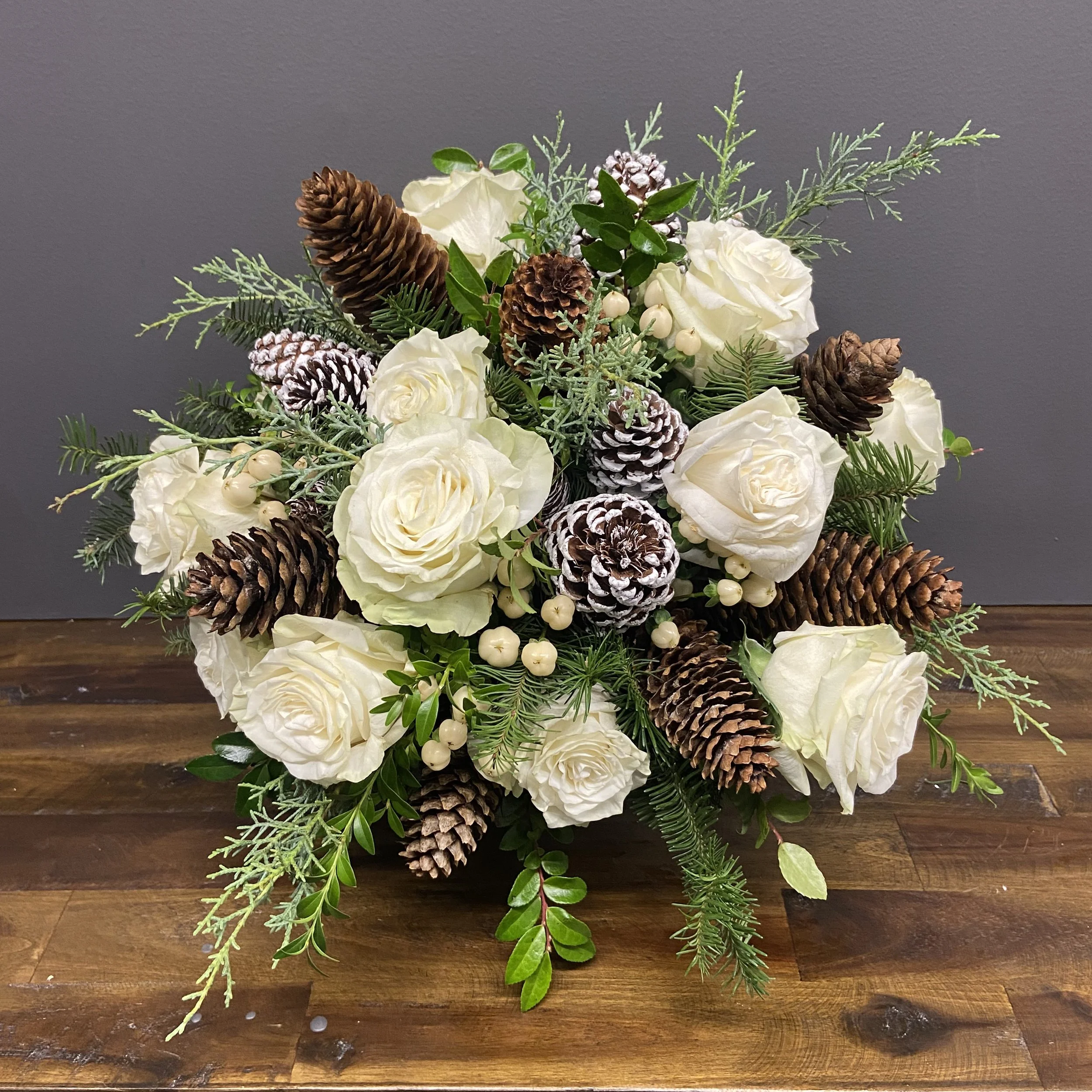 Enjoy this seasonal arrangement composed of fragrant foliage, white roses, white cones and berries. The perfect gift for any occasion.